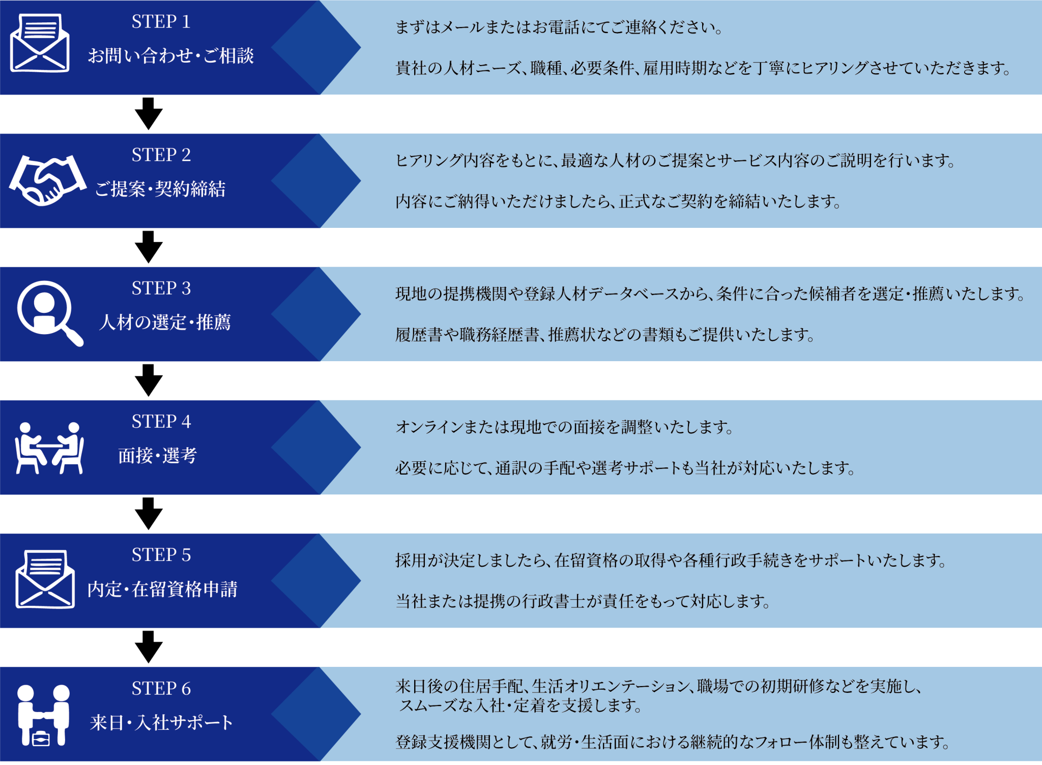 入国後のオリエンテーション研修から、職場定着を目的としたフォローアップ支援、さらには就業先に応じたスキルアップ研修や日本語能力の向上支援まで、当社は段階的かつ実践的な教育体制を整えております。特定技能人材をはじめとする外国人スタッフが安心して長く働けるよう、定期的な面談や生活・就労に関する相談対応も実施し、企業様と人材の双方にとって最適な環境づくりを支援いたします。